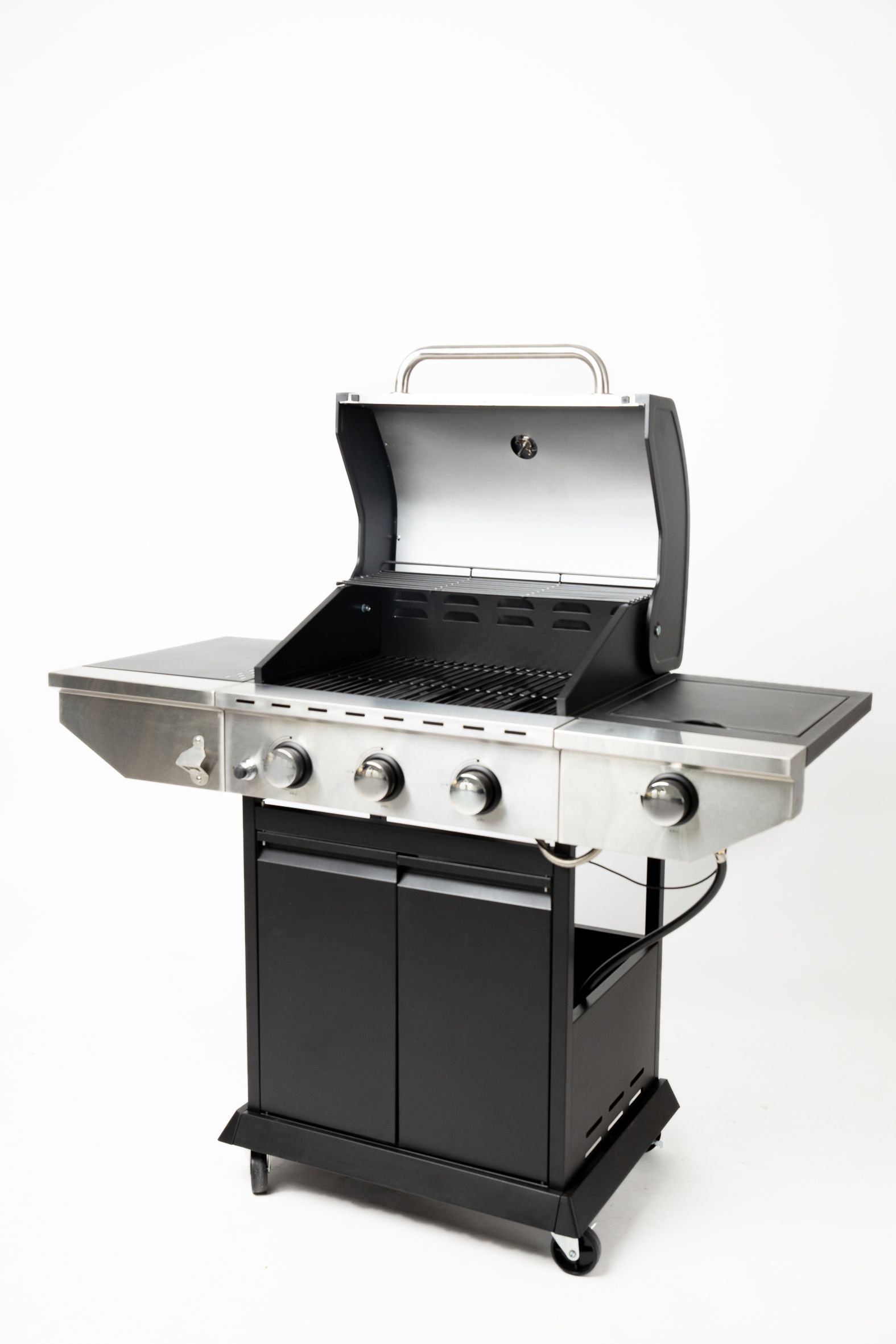 4.Fast & Even Heat: One-button electronic ignition system, reliable enough to fire up burners immediately. with four wheels (two directional wheels, two steering wheels)