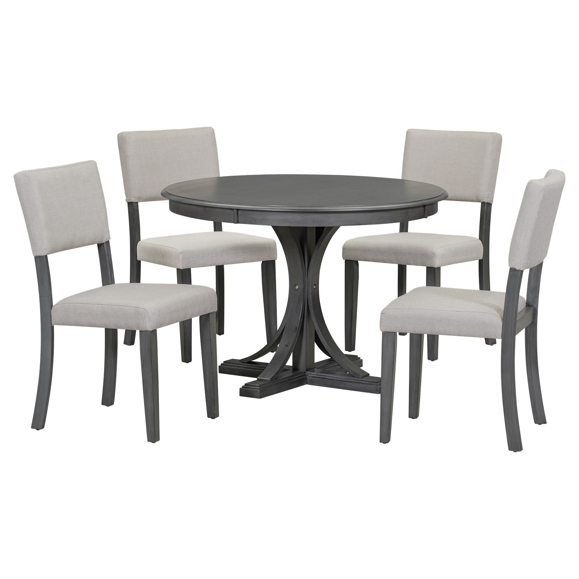 The 5-piece dining set is composed of one dining table and four chairs. Designed practically and compactly, it can easily fit into your space and seat up to four family members. Round table top with no sharp corners helps to protect your children and the elderly. The design takes into account the sense of use and comfort.