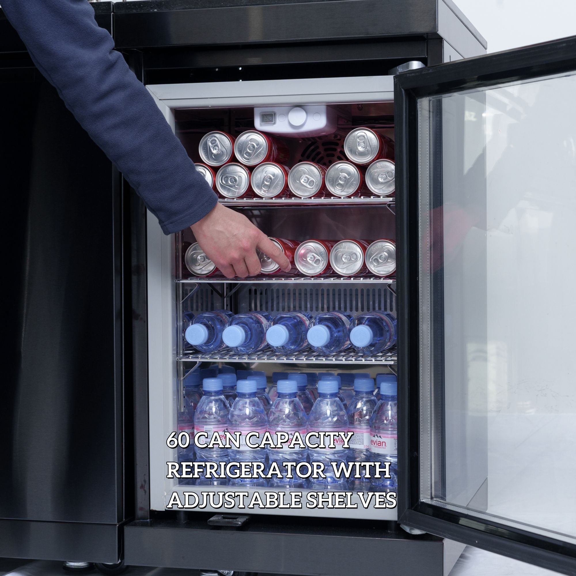 REFRIGERATOR FEATURES - The outdoor rated ONRUN refrigerator is made with heavy duty 304 stainless steel construction for durability and resistance to the elements. It comes with a stylish glass door for easy viewing of contents and interior blue lighting as well to improve visibility and overall user experience. Additional features include temperature control, adjustable shelves, and a lockable door to secure contents and prevent unauthorized access. Dimensions - 18 1/2' x 18' x 26 1/2'