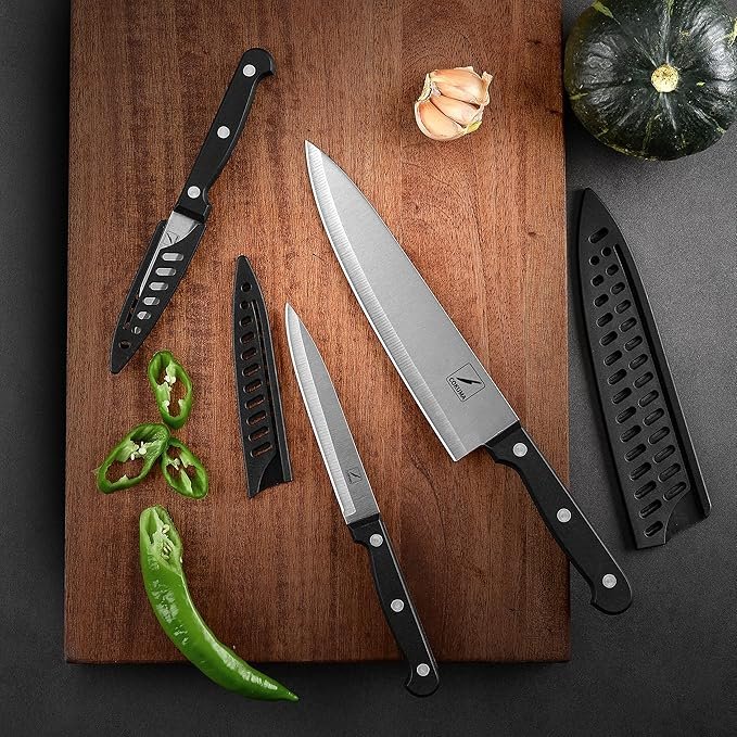 1.Includes chef, utility, and paring knives for versatile kitchen use.